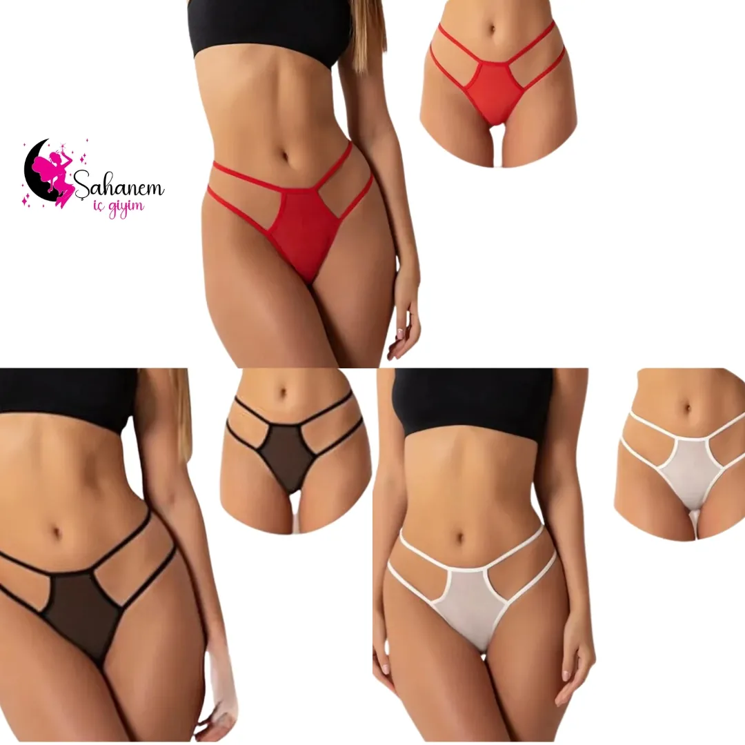 Ürün 3 parçadan oluşmaktadır.1 adet Siyah String. 1 adet Beyaz String. ve 1 adet Kırmızı String..Fantazi seksi TÜL kadın string, zarafeti ve çekiciliğiyle dikkat çeken bir iç giyim parçasıdır. Bu özel tanga, kadınların kendilerini özgüvenle ifade etmelerini sağlar. Yüksek kaliteli TÜL malzemelerden üretilmiş olan bu ürün, kullanıcısına rahatlık ve şıklık sunar. rengi ve zarif detaylarıyla göz alıcı bir görünüm sağlayan bu string, özel anlarda romantizmi ve tutkuyu arttırır. bu ürün, online alışveriş platformlarında aranan ve tercih edilen bir seçenek haline gelmiştir.